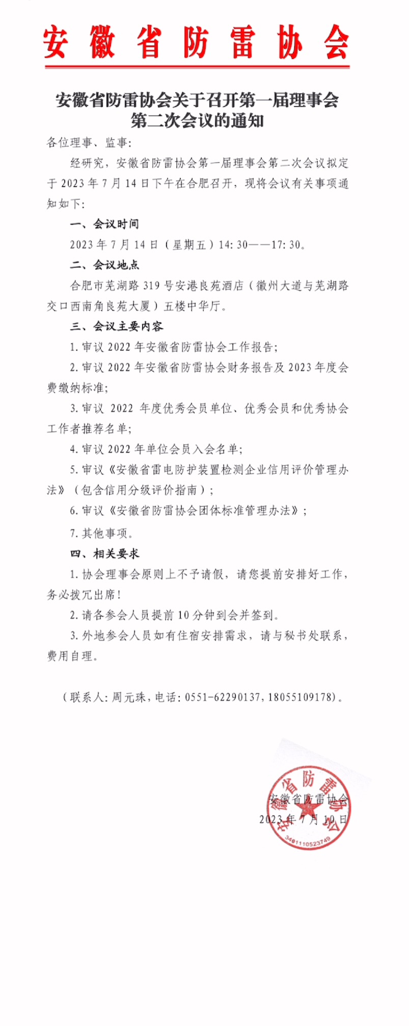 安徽省防雷协会关于召开第一届理事会第二次会议的通知