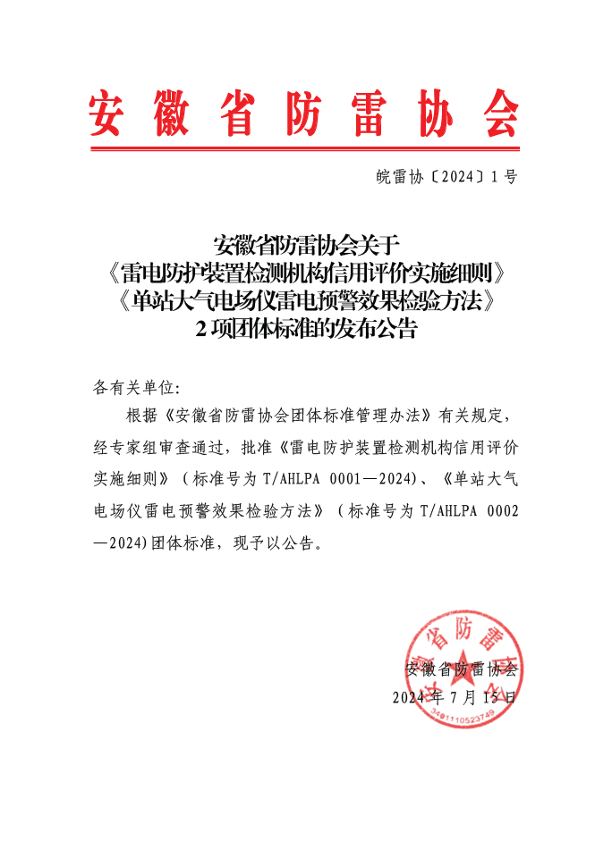 安徽省防雷协会关于《雷电防护装置检测机构信用评价实施细则》《单站大气电场仪雷电预警效果检验方法》2 项团体标准的发布公告