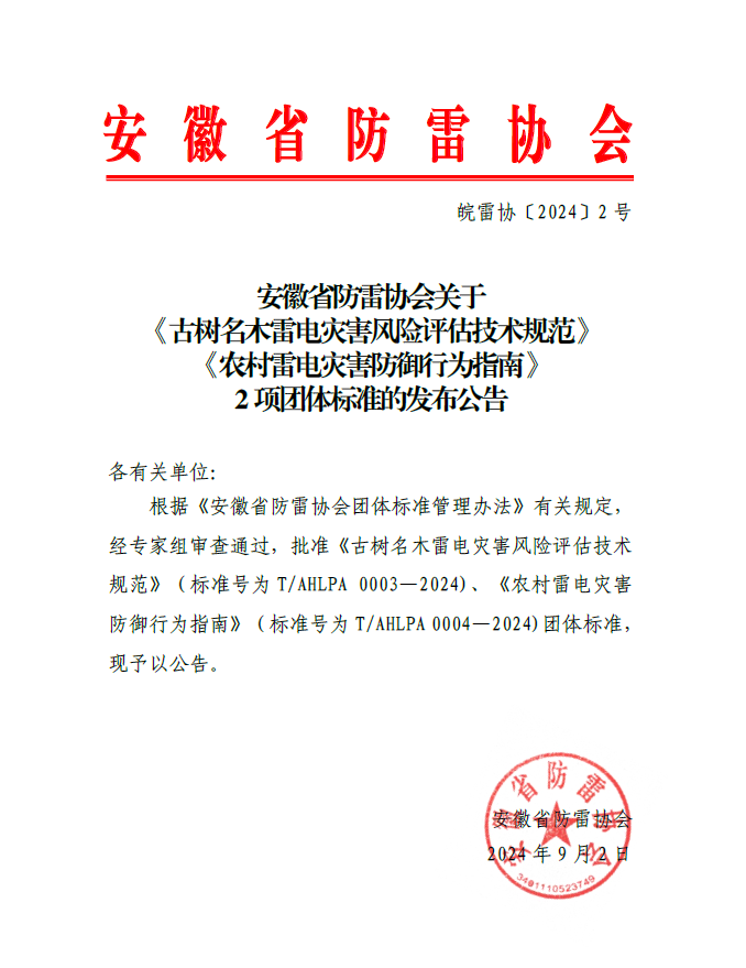 安徽省防雷协会关于《古树名木雷电灾害风险评估技术规范》《农村雷电灾害防御行为指南》2 项团体标准的发布公告