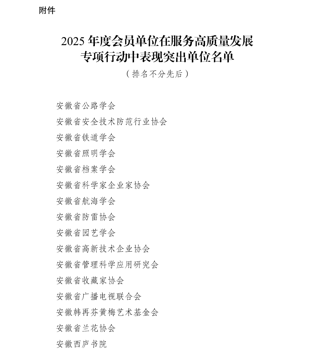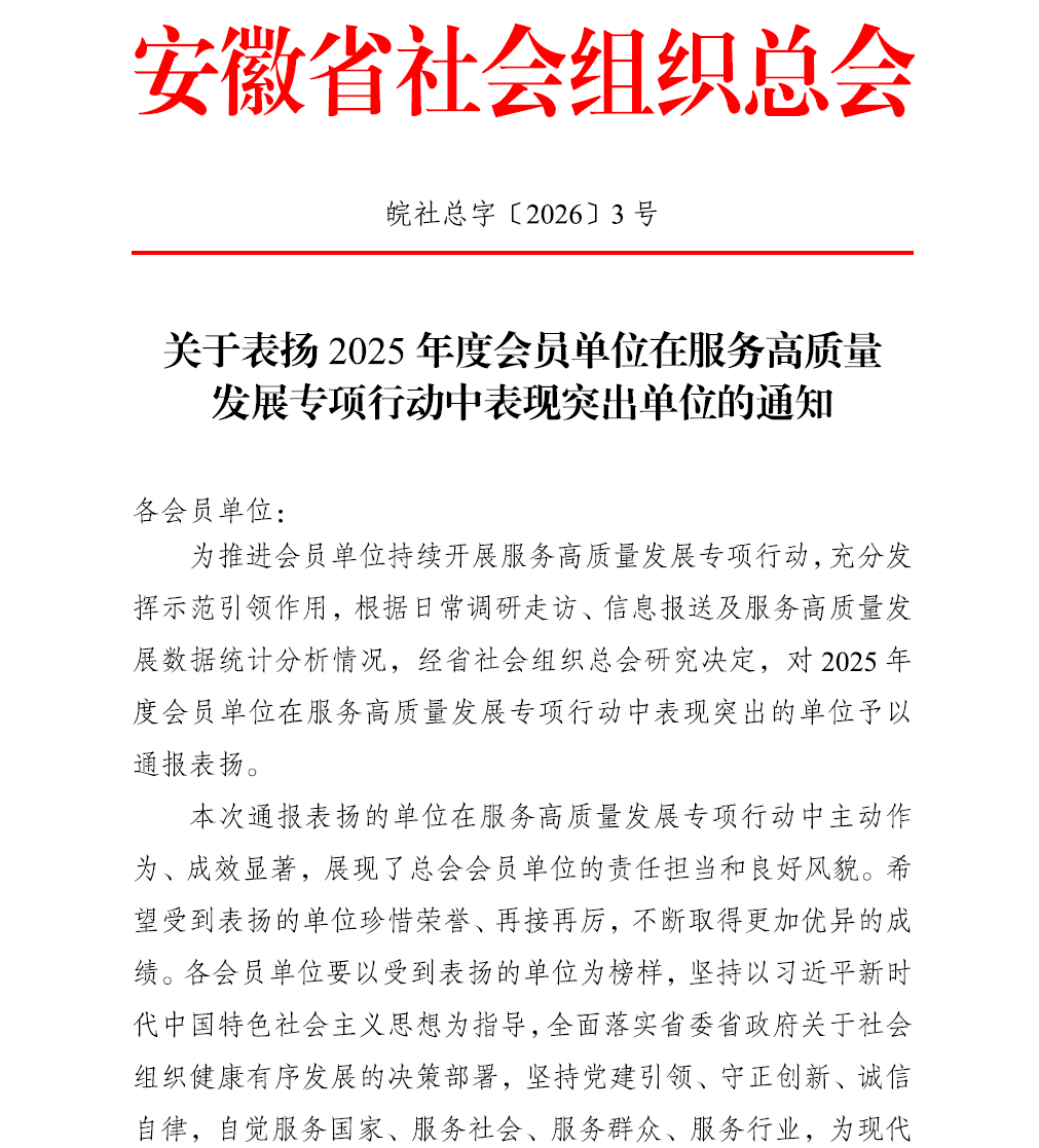 安徽省社会组织总会关于表扬2025年会员单位服务高质量发展中表现突出单位的通知
